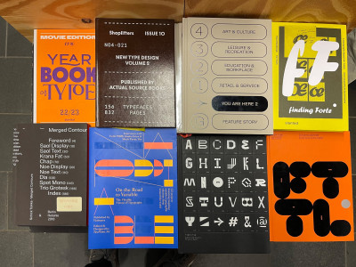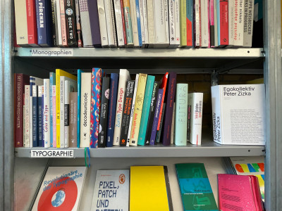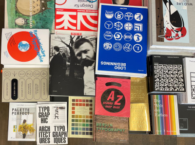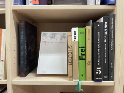 Handy selection of typography books in the bookshop right next to Künstlerbedarf Modulor. Unfortunately, some titles are shrink-wrapped and therefore not viewable.